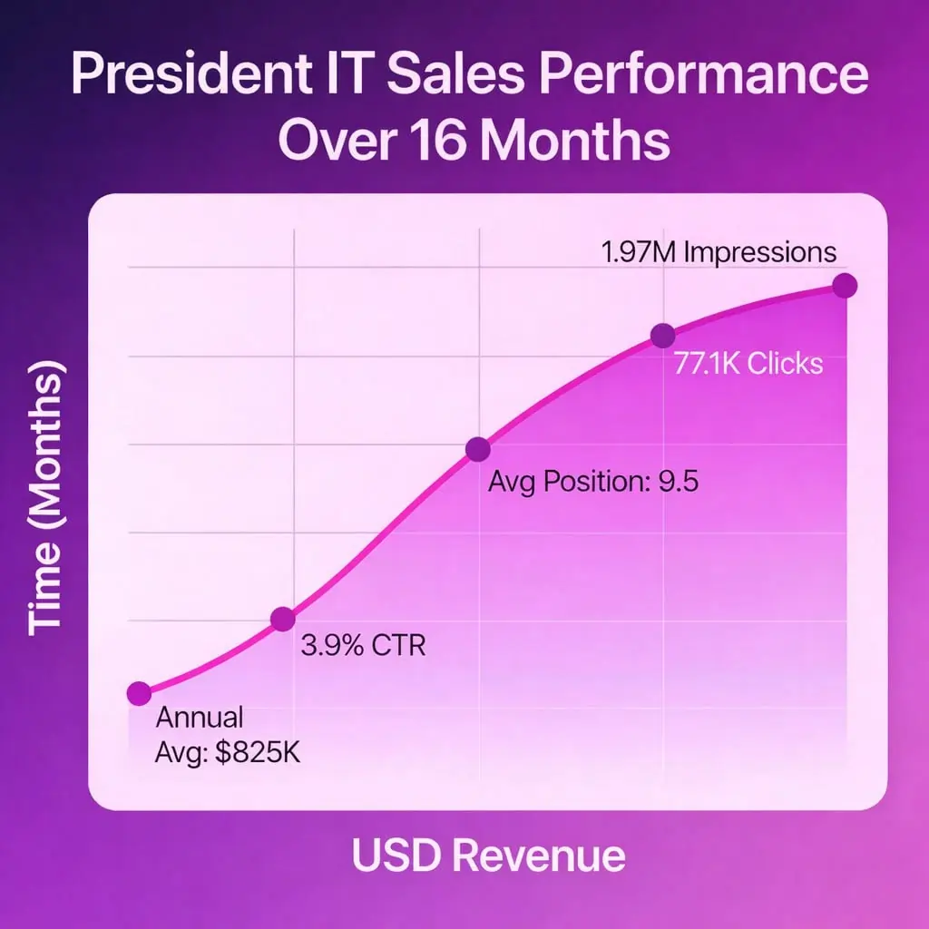 One of our biggest success stories is how LoreSense Agency was able to boost the business growth of Presidentit. Over the last 16 months, President IT has generated Driving $825K Annual Sales and 77.1K clicks through marketing strategies.